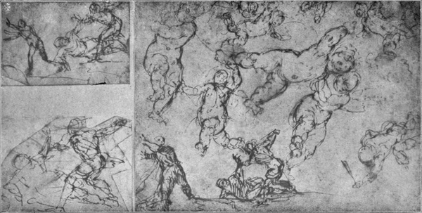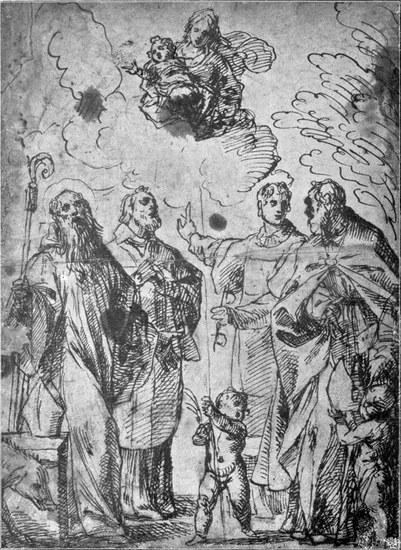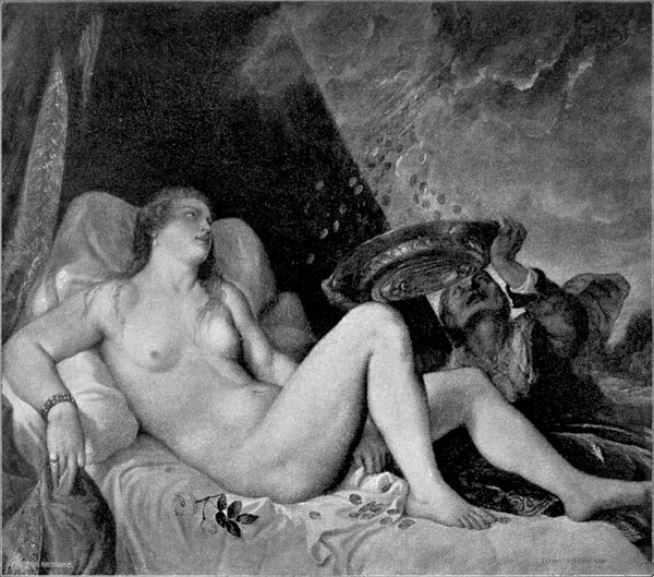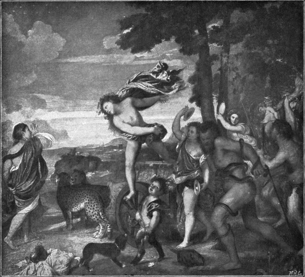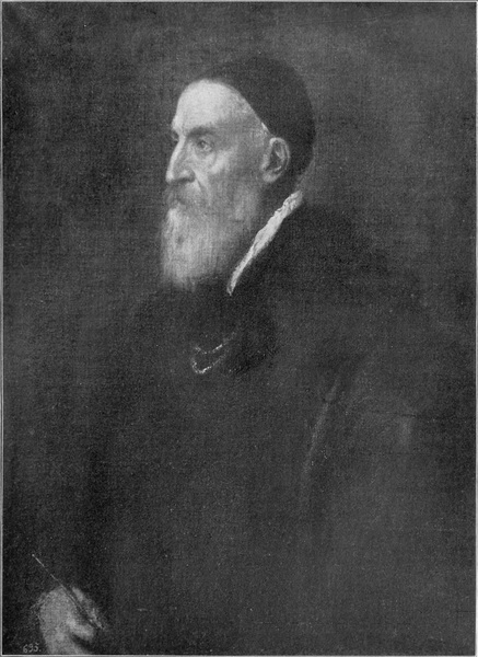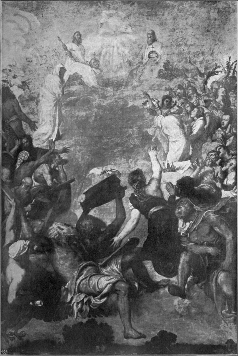 Eine in dem nämlichen Briefe von 1554 angekündigte und vermutlich 1556 abgesandte Darstellung von Perseus und Andromeda, die von Vasari besonders gerühmt wird, und ein gleichzeitiges, für die Königin[S. 132] bestimmtes Andachtsbild sind verschwunden. — Über welch mächtige Schaffenskraft der Meister noch verfügte, bekunden mehrere für Venedig gemalte und noch dort befindliche Werke, die zweifellos auch der Erfindung nach der Zeit vom Ende des achten und vom Beginne des neunten Jahrzehnts seines Lebens angehören.