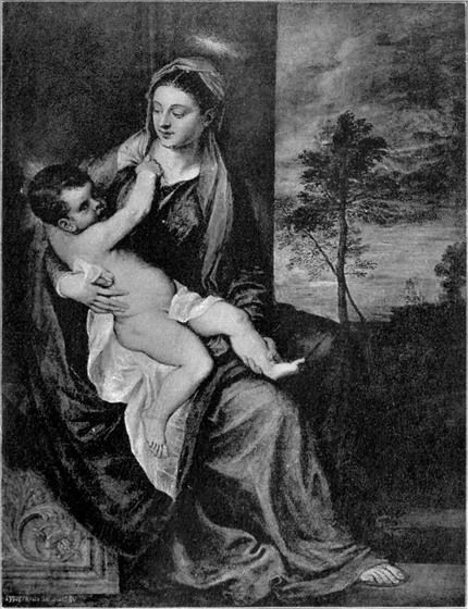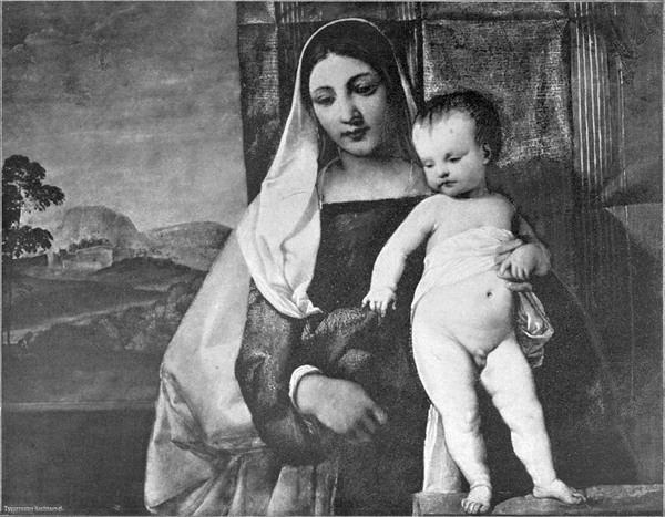 Ein unbestritten echtes, gleichfalls noch ziemlich frühes Jugendwerk Tizians ist ein Marienbild in der kaiserlichen Gemäldegalerie zu Wien, das im Volksmunde die sonderbare Bezeichnung „Zigeunermadonna“ führt (Abb. 4). Hier ist die Formengebung schon eine durchaus sichere; namentlich in der Gestalt des Kindes fällt der Fortschritt in der Zeichnung gegenüber dem erstgenannten Wiener Bilde sofort in die Augen. Ein allerliebstes gesundes Knäblein ist dieses Jesuskind, das, an die Mutter angelehnt, auf einer Steinbrüstung steht und spielend mit dem einen Händchen die Falten von Marias Mantel, mit dem anderen die Finger der haltenden Mutterhand anfaßt. Diese Maria ist durchaus keine gesuchte Idealschönheit, sondern nur eine[S. 11] hübsche Venezianerin; aber es liegt etwas Weihevolles über ihrem stillen, bescheidenen Antlitz und über ihrer von Schleier und Mantel umhüllten Gestalt, das mit der Stimmung der Linien und Töne des ganzen Gemäldes zusammenklingt und dasselbe zu einem echten Andachtsbild macht. Den Hintergrund bildet zum Teil ein grünseidener Vorhang, zum Teil ein Blick ins Freie; da sieht man in eine Hügellandschaft, in der sich ein volles Gefühl für die Poesie der unter blauem Himmel sich ausdehnenden Weite ausspricht.