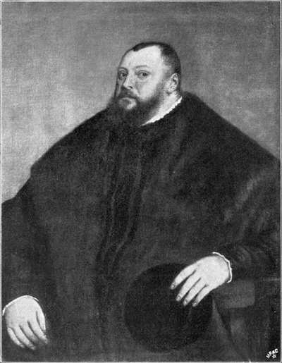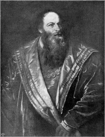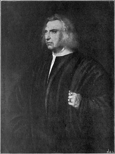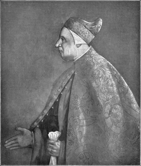 In die Zeit der Arbeiten am Fondaco de’ Tedeschi wird die Entstehung eines merkwürdigen Bildnisses verlegt, das sich in der Gemäldesammlung des Vatikans befindet. Es stellt einen Dogen von Venedig dar, in lebensgroßer Halbfigur, bekleidet mit der eigentümlichen Mütze und dem altertümlich geschnittenen Brokatmantel des Oberhauptes der Republik. Der charaktervolle Kopf ist scharf im Profil gesehen, die Hände kommen unter dem Mantel heraus; die Linke hält ein Battisttuch, die Rechte — die leider durch Übermalung ganz entstellt ist — ist wie zu einer Begrüßungsansprache vorgestreckt. Man kann sich nichts Überzeugenderes von Lebenswahrheit denken, als dieses durch die großartigste Einfachheit ausgezeichnete Bildnis, in dem gewissermaßen die ganze Besonderheit der Würde des Mannes, dem die stolze Republik die Leitung ihrer Macht anvertraut hat, zum Ausdruck kommt. Und doch hat Tizian dieses Porträt nicht nach dem Leben gemalt. Den regierenden Dogen zu porträtieren war ein Vorrecht, das dem alten Giovan Bellini, solange er lebte, niemals entzogen wurde. Tizian hat hier auf der Grundlage irgend eines alten Porträts, vermutlich im Auftrage der betreffenden Familie, die Erscheinung eines längst Verstorbenen, des Dogen Niccolo Marcello, der von 1473 bis 1474 die Herrschaft innegehabt hatte, mit wunderbarer Meisterschaft glaubwürdig ins Leben gerufen (Abb. 12).