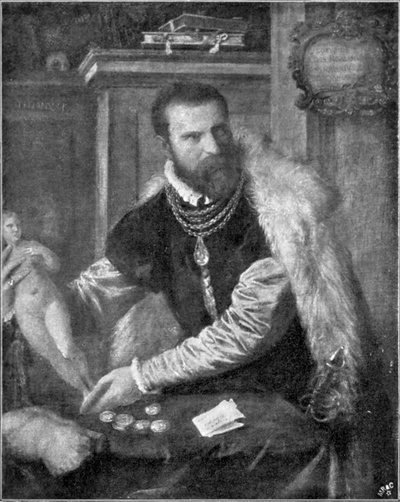In ganz ungeschwächter Meisterschaft tritt uns Tizian in einem Porträt von 1566 entgegen, das sich in der kaiserlichen Gemäldegalerie zu Wien befindet. Es ist das Bild des Altertumshändlers Jacopo Strada, das völlig ebenbürtig neben den ebendort befindlichen Meisterwerken der Bildniskunst aus Tizians früherer Zeit, den Porträts des Arztes Parma (Abb. 117) und des Geschichtschreibers Varchi steht. Der Handel mit Kunstaltertümern war ein schwunghaftes Geschäft in Venedig; Tizian selbst beschäftigte sich gelegentlich mit dergleichen Dingen, und sein Urteil darin galt als das des höchsten Sachverständigen. Strada hatte von Kaiser Ferdinand die Titel eines kaiserlichen Antiquarius und Hofrates verliehen bekommen. In dem ebenso lebendigen wie farbenprächtigen Bilde steht er in schwarzer und hellroter Kleidung, mit einem langhaarigen weißlichen Pelz über den Schultern, an einem grünbedeckten Tische, auf dem man neben goldenen und silbernen Denkmünzen und einem Brief mit Tizians Adresse einen kleinen Marmortorso und ein altertümliches Bronzefigürchen sieht. Er hebt mit beiden Händen eine Venusstatuette auf, um sie mit lebhafter Wendung einem außerhalb des Bildes gedachten Kunstkenner zu zeigen. Die ganze Erscheinung ist die eines gewandten Mannes, der viel auf sich hält. Er trägt den Degen und die Ritterkette, zu deren Anlegung ihn die kaiserlichen Titel berechtigen, und diese Titel selbst sind neben dem eines römischen Bürgers auf einer schmuckvollen Inschrifttafel angebracht (Abb. 118). Das Bild ist sichtlich schnell gemalt; in dem Pelz erkennt man deutlich die Spuren des Daumens, den Tizian nach der Aussage eines seiner Schüler in seinen späteren Jahren viel beim Malen gebrauchte.