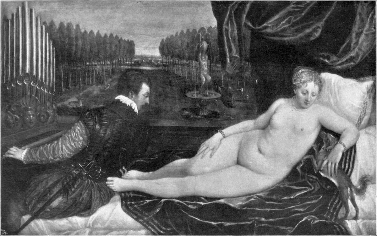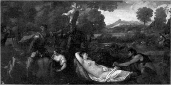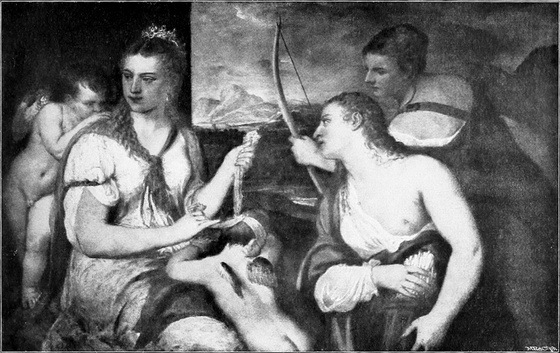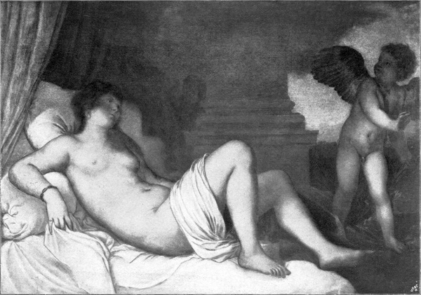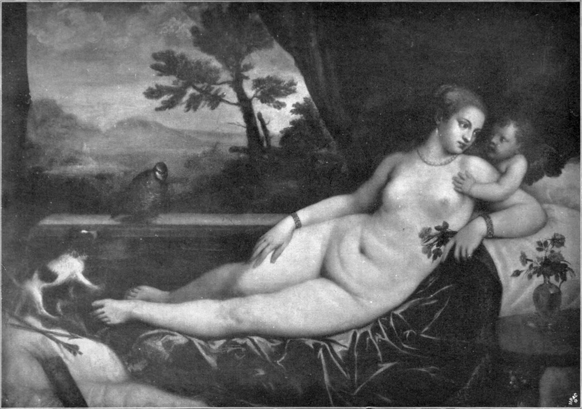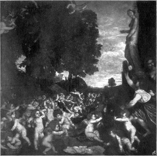 Dieses staunenswürdige Gemälde ist nicht das einzige, durch das Tizian noch im höchsten Alter die Leistungsfähigkeit seiner Künstlerkraft bekundete. Um dieselbe Zeit mag er das kräftig gestimmte Bild des heiligen Hieronymus gemalt haben, das aus einer Kirche Venedigs in die Sammlung der Brera zu Mailand gekommen ist. Auch das kostbare Meisterwerk „Venus und Cupido“ in der Borghesischen Sammlung zu Rom gehört zu diesen späten Schöpfungen. In der Komposition erinnert dasselbe an die „Allegorie des Davalos“ und an die „Einweihung der Bacchantin“. Aber der Inhalt ist neu; die Ausrüstung des Liebesgottes wird geschildert. Der kleine Cupido lehnt sich auf die Kniee der Venus, und diese verbindet ihm die Augen; die Grazien bringen ihm den wohlgefüllten Köcher und den Bogen. Hinter Venus steht auf ihrem Sitz ein anderer Liebesgott, der sich an ihre Schulter lehnt und sich boshaft freut im Gedanken an das Unheil, welches das so ausgerüstete Brüderchen, blind seine Pfeile versendend, in der Welt anstiften wird; er scheint eben eine vorlaute Bemerkung gemacht zu haben, die ihm einen verwarnenden Blick der Mutter zuzieht (Abb. 120).
