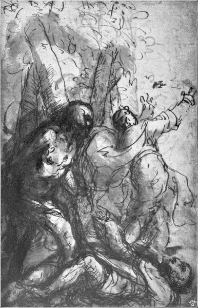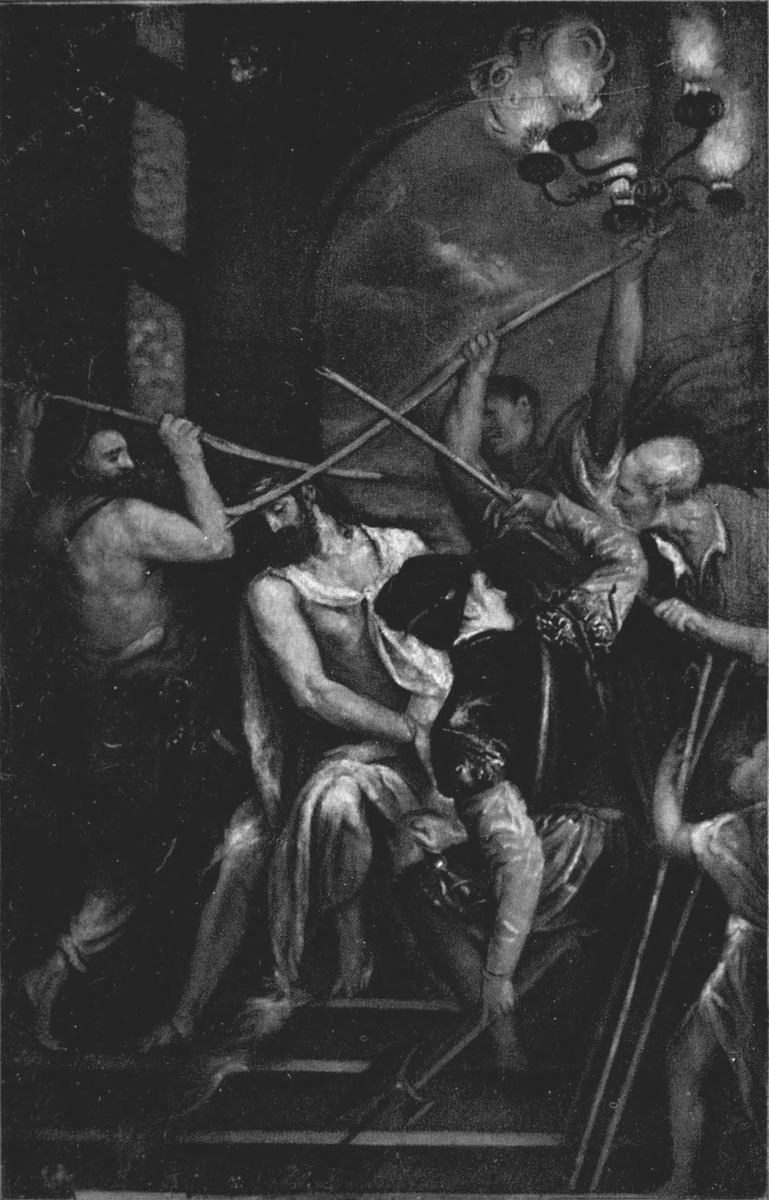 Eines Tages sah der hochbegabte Tintoretto, selbst damals kein junger Mann mehr — er war 1519 geboren —, ein bestimmungsloses und beiseite gestelltes Bild bei Tizian, das ihm als ein unvergleichliches Vorbild für die Art, wie man malen müsse, erschien; er erbat und bekam dasselbe von dem Meister zum Geschenk. Dieses Gemälde stellte die Dornenkrönung Christi dar, und es ist wohl zweifellos in dem jetzt in der Münchener Pinakothek befindlichen Bilde dieses Gegenstandes erhalten (Abb. 121). Die Malweise ist hier in der That etwas ganz Wunderbares. In der Nähe sieht man nur ein Durcheinander von schwarzen, weißen, roten und gelben Flecken, die mit breiten Pinseln hingehauen sind; und wenn man den richtigen Abstand nimmt, verschmilzt alles zu durchgebildeter körperhafter Erscheinung und zu tiefer, reicher Farbenwirkung. Und was für eine großartige Gestaltungskraft spricht noch aus dem Linienzug und der Massenverteilung der Komposition, aus der wilden Lebendigkeit der Schergen und aus dem erschütternden Dulderausdruck des gemarterten Christus! Und welches Stimmungsgefühl liegt noch in der düsteren, von den qualmenden Flammen eines Hängeleuchters ausgehenden Beleuchtung!