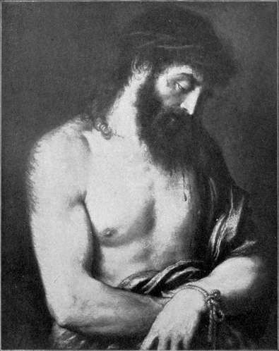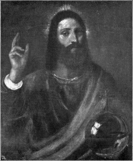 Einige von den allerletzten Werken des Meisters befinden sich in der Sammlung der Ermitage zu Petersburg, in die der größte Teil der Bilder gekommen ist, welche bei Tizians Tode in dessen Werkstatt standen. Dazu gehört ein Bild des segnenden Erlösers mit der gläsernen Weltkugel in der Hand, das ein höchst bezeichnendes Beispiel seiner spätesten Malweise ist. Wenn auch die Hand des Künstlers nicht mehr fest und sein Farbengefühl getrübt war und wenn er sich bei den Nebendingen mit Andeutungen in breiten Pinselstrichen begnügte, so war er doch noch imstande, in Hand und Antlitz des Erlösers eine heilige Erhabenheit zum Ausdruck zu bringen (Abb. 122).