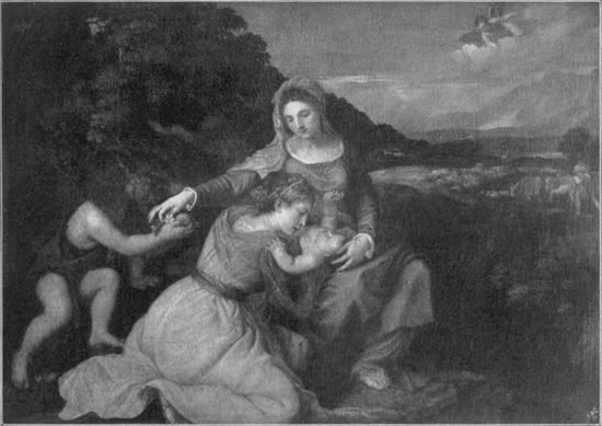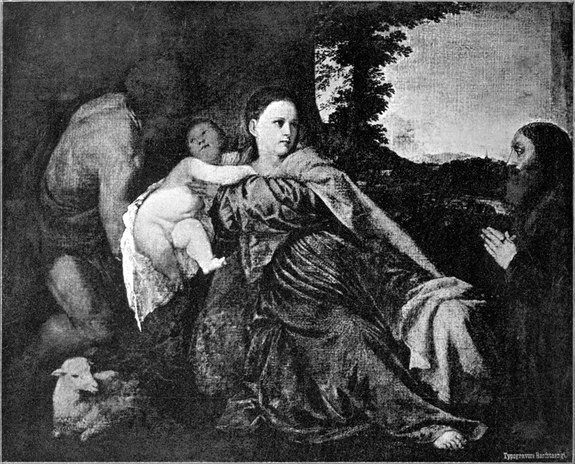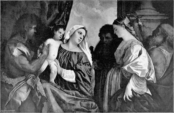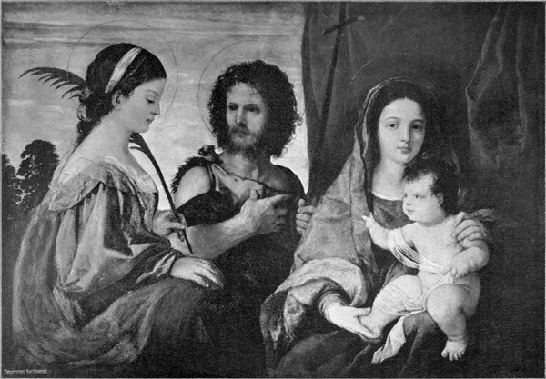 Vielleicht darf man hier ein Gemälde voranstellen, das sich in der fürstlich-Liechtensteinschen Galerie zu Wien befindet. Es ist ein Andachtsbild von jener in der Bellinischule besonders beliebten Art, die verschiedene Heilige in der Verehrung des von der Jungfrau Maria gehaltenen Jesuskindes vereinigt zeigt. Vor einem roten Vorhang sitzt Maria, dem Beschauer zugewendet, und das Kind dreht sich nach der heiligen Katharina um, die, von Johannes dem Täufer geleitet, mit einem lieblichen Ausdruck mädchenhafter Schüchternheit herantritt. Katharina ist gekennzeichnet durch die Märtyrerpalme in der einen Hand und ihr Marterwerkzeug, das Rad, auf das sie die andere Hand legt. Sie und der dunkellockige Johannes heben sich in sprechenden[S. 7] Umrissen von der blauen Luft ab, im Gegensatz zu der Gruppe von Mutter und Kind, die im wesentlichen als Helligkeitsmasse aus dem tiefen Ton des Vorhangs hervorkommt (Abb. 2). Das liebenswürdige Gemälde besitzt Tizians Farbenreiz, und es entspricht auch in der Linienkomposition seiner Art und Weise. Aber es zeigt auffallende Mängel in der Zeichnung. Darum wird sein Tizianscher Ursprung bezweifelt, und man möchte es als das Werk eines seiner Schüler ansehen, der es unter starkem Einfluß des Meisters geschaffen habe. Aber dagegen läßt sich einwenden, daß die Farbe[S. 8] doch das Feinste in der Malerei ist, daß ein Lehrer eher die Zeichnung eines Schülers zu berichtigen, als ihm sein Farbengefühl mitzuteilen vermag. So mögen wir das Bild wohl als Probe von Tizians Kunst aus einer Zeit betrachten, wo er zwar die Formengebung noch nicht voll in der Gewalt hatte, aber schon imstande war, seinem dichterischen Farbenempfinden Ausdruck zu geben.