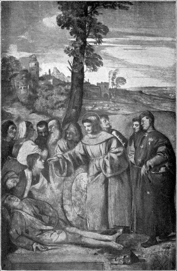 Die zur Bekämpfung der verheerenden Krankheit erlassenen Gesetze enthielten die Bestimmung, daß keiner, der an der Pest gestorben war, in einer Kirche begraben werden durfte. Aber bei dem großen Tizian wurde eine Ausnahme gemacht. Auf Befehl der Regierung wurde der Leichnam am 28. August, unter dem Geleit der Domherren von S. Marco, in die Frarikirche gebracht und unter fürstlichen Ehrenbezeugungen an der Stelle, an der er begraben zu werden gewünscht hatte, eingebettet.