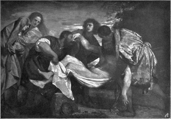 Den letzteren Auftrag führte Tizian in der kurzen Zeit von sechs Wochen aus. An den mythologischen Bildern hatte er seit Jahren mit Fleiß gearbeitet. Am 27. September 1559 wurden die drei Gemälde nach Madrid abgeschickt. Tizian hatte noch ein viertes, kleineres hinzugefügt, das Bild einer Dame in gelber Kleidung und morgenländischem Aufputz; in seinem Begleitschreiben bezeichnete er es als das Abbild derjenigen, die die unbedingte Herrin seiner Seele sei, so daß er dem Könige nichts Lieberes und Kostbareres senden könne. Über den Verbleib dieses letztgenannten Bildes, in dem man wohl[S. 136] mit Recht ein Phantasieporträt Lavinias vermutet, ist nichts bekannt. Die beiden „Poesien,“ in denen die Mythen von Diana und Aktäon und von Diana und Kalisto in figurenreichen Darstellungen geschildert werden, sind im Anfang des XVIII. Jahrhunderts von König Philipp V. an den Marquis von Gramont verschenkt worden und befinden sich jetzt in der Sammlung des Lord Ellesmere zu London. Das Museum zu Madrid bewahrt von ihnen sehr geschickt gemalte Kopien in verkleinertem Maßstab, die neben den älteren Werken verwandten Inhalts bekunden, daß der Reiz, den Tizian in derartige Darstellungen zu legen wußte, im Erlöschen war. — Ein fesselndes Werk ist die schnell gemalte Grablegung, die, nachdem sie zuerst in Aranjuez, dann im Escorial einen Altar geziert hatte, sich jetzt ebenfalls im Pradomuseum befindet. In der Komposition unterscheidet sich dieses Gemälde von dem um mehr als ein Menschenalter früher entstandenen inhaltsgleichen Pariser Bilde hauptsächlich dadurch, daß der heilige Leichnam nicht zu Grabe getragen, sondern in einen Marmorsarkophag hinabgesenkt wird. Von der Herzenswärme und dem Farbenzauber, die in dem früheren Bilde leben, ist keine Rede mehr. Aber das Machwerk ist staunenswürdig. In ein einigermaßen eintönig zusammenklingendes Ganze sind ein paar starke Farben — Krapprot in der Kleidung des Nikodemus, der in gebückter Stellung die Beine des Heilandes hält, und Blau im Mantel der Mutter Maria — keck hineingesetzt. Das ganze Gemälde offenbart sich als das Werk eines Künstlers, der ein ungeheures Maß von Wissen und Können spielend beherrscht und dem es dadurch gelungen ist, auch ohne viel Aufwendung von Herzensarbeit in glücklichem Wurf noch ein schönes Bild zu schaffen (Abb. 106).