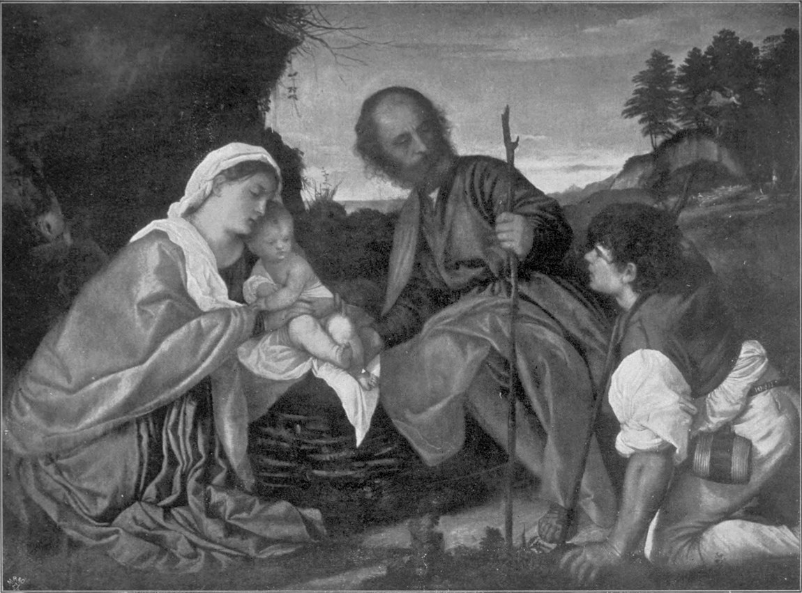 Die Nationalgalerie zu London besitzt ein Gemälde, bei dem ein Zweifel darüber, ob es ein Werk Tizians aus seiner Jugendzeit sei, wohl kaum bestehen kann. Es stellt die Krippe zu Bethlehem dar (Abb. 3). Maria und Joseph, dieser sitzend, jene[S. 9] knieend, halten das sehr zarte Kind zwischen sich auf der aus Korbgeflecht gebildeten Krippe. Maria schmiegt ihre Wange an den Scheitel des Kindes; der im Ausdruck sehr innige Kopf setzt mit einem weißen Schleier ganz hell von der dunklen Wand eines Felsens ab. Josephs dunkler Kopf steht auf der lichten Luft. Der Blick des Pflegevaters ist auf den ersten Ankömmling der Hirten gerichtet — es ist eine prächtige Figur eines italienischen Hirtenbuben —, der niederknieend seine Blicke treuherzig und gläubig in die Augen des Kindes senkt. Im Hintergrund sieht man den Verkündigungsengel bei den Schafhirten im Felde. Der Ochs und der Esel, die nach alter Überlieferung bei dieser Darstellung nicht fehlen dürfen, werden an der Felswand im Rücken Marias sichtbar. — Auch in diesem sehr schönen Bild machen sich auffallende Unvollkommenheiten der Zeichnung bemerklich; besonders störend in der Figur Josephs, wo der Kopf nicht recht auf den Schultern sitzt.