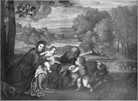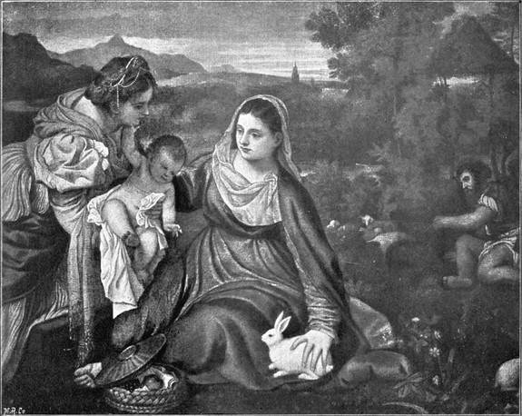Soviel Poesie auch in solchen Halbfigurengruppen Tizians lebt: das volle Maß seiner malerischen Dichtkunst offenbart sich erst da, wo der Künstler die Darstellung ganz ins Freie verlegt und aus Figuren und Landschaft ein stimmungsvolles Ganzes zusammenwirkt. Solch eine Tiziansche Landschaft ist nicht, wie etwa bei Raffaels Madonnen im Grünen, nur eine reizvollere Art des Hintergrundes, sondern in ihr steckt ebensoviel künstlerisches Empfinden, wie in den Figuren, sie ist etwas Beseeltes, in dessen Wesen der Maler sich mit Schönheitswonne vertieft, und das er zum vollendetsten Zusammenklange mit der Formen- und Farbenstimmung der Figuren gebracht hat. Die Nationalgalerie zu London besitzt ein Marienbild von dieser Art, von dem man nach der großen Ähnlichkeit des Kopfes der Jungfrau mit der ebengenannten Florentiner Madonna wohl annehmen muß, daß es um dieselbe Zeit wie dieses entstanden sei. Maria sitzt auf einer Bodenerhöhung; neben ihr, in ehrerbietigem Abstand, der kleine Johannes, der auch hier wieder Blumen darreicht. Ohne die Augen von der zärtlichen Betrachtung des auf ihrem Schoße liegenden Kindes zu erheben, nimmt die Jungfrau die Blumenspende aus der Hand des Johannes. Vor ihr kniet die heilige Katharina und herzt mit mädchenhafter Freude das Jesuskind. Das gelbe Kleid Katharinas und das Rot und Blau der Gewandung Marias bilden einen vollkräftigen Zusammenklang der drei Grundfarben. Und dahinter spannt sich ein landschaftlicher Farbenzauber aus. Dichtbelaubte Bäume stehen auf dem grünen Hang des Hügels, auf dem die Gruppe ruht; eine dunkelbewaldete zweite Höhe senkt sich zu einer Ebene hinab, in der Hirten ihre Herden weiden lassen; der Spiegel eines Sees erglänzt in bläulicher Ferne, und weiterhin schweift der Blick über sanfte Hügelwellen bis zu dem ragenden Hochgebirge; auf den Gipfeln lagern die Wolkenmassen. Das Licht der Abendsonne dringt durch die Risse eines Dunstschleiers und färbt den Rand eines dichten Wolkengebildes mit rötlicher Glut. Oben in diesem Wolkenrand erscheint ein Engel, um die Hirten auf der Flur, die ein Wiederschein des goldigen Lichtes erhellt, zur Verehrung des göttlichen Kindes herbeizurufen (Abb. 9).