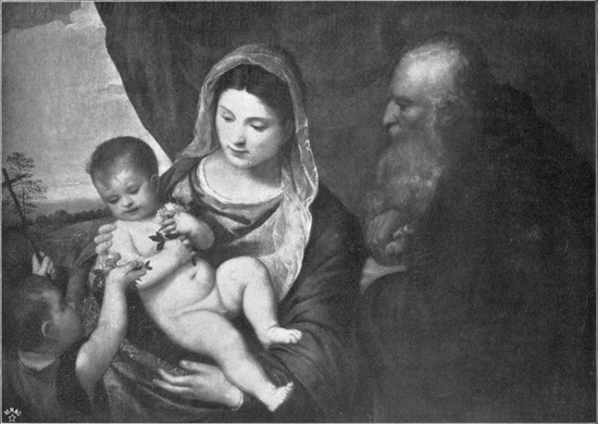 An den Schluß der Reihe von Muttergottesbildern in Halbfiguren, die uns von Tizians Jugendentwickelung innerhalb eines Zeitraums, dessen Grenzpunkte sich nicht bestimmen lassen, die beste Anschauung gewährt, kann man ein liebliches Gemälde in der Uffiziengalerie stellen, ein Meisterwerk kostbarster liebevoller Ausführung. Das Jesuskind, gleich seiner Mutter eine Erscheinung von süßer Holdseligkeit, ruht halb liegend, halb sitzend auf den Armen Marias und auf dem Mantel, den sie von Arm zu Arm herüberzieht; es hält die Händchen voll Rosen und wendet das Köpfchen einer weiteren Rosenspende zu, die der kleine Johannes diensteifrig mit hochgestrecktem Arm ihm darreicht. Seitwärts steht der heilige Einsiedler Antonius, ein wunderschöner Greis, mit beiden Händen auf den ihn kennzeichnenden T-förmigen Stab gestützt, und versenkt sich mit stiller Innigkeit in die Betrachtung des kindgewordenen Gottessohnes. Den Hintergrund bildet zum größten Teil ein Vorhang von bräunlicher Farbe; nur ganz seitwärts, an den Köpfen der beiden Kinder, wird ein Stückchen duftiger Landschaft unter einer lichten Wolkenwand sichtbar (Abb. 8). In dem Bewußtsein, etwas Wohlgelungenes geschaffen zu haben, hat Tizian dieses Bild mit seinem Namen bezeichnet.