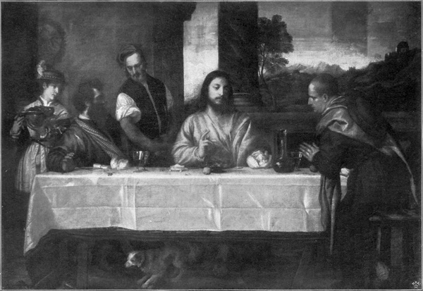 Im Juli 1563 teilte Tizian dem König Philipp II. mit, daß er beabsichtige, nach so vielen Fabeldarstellungen ihm ein großes religiöses Geschichtsbild zu übersenden; und zwar sollte dies ein vor sechs Jahren angefangenes Bild des letzten Abendmahles des Herrn in lebensgroßen Figuren sein. Nach dem Wortlaut des Briefes fehlte nicht mehr viel an der Vollendung des Gemäldes. Aber erst im Herbst 1564 wurde das umfangreiche Werk fertig. Garcia Hernandez, der spanische Geschäftsträger in Venedig, war überzeugt, daß Tizian die Ablieferung des Bildes absichtlich verzögere „nach seiner Schlauheit und Habsucht“, bis zum Eintreffen eines Befehls von seiten des Königs zur Berichtigung der wieder vorhandenen Rückstände. Tizian hatte wohl gelernt, mißtrauisch in dieser Beziehung zu sein. Philipp II. aber gab sich ehrlich Mühe, ihm zu allem was ihm zugesichert worden war, zu verhelfen; er erließ im Jahre 1564 dahingehende Befehle nicht nur an den Statthalter von Mailand, sondern auch an den Vizekönig von Neapel, der die Verwirklichung gewisser Einkünfte von dort, die Karl V. vor vielen Jahren dem Meister angewiesen hatte, ohne daß dieser jemals zu deren Genuß gekommen wäre, besorgen[S. 141] sollte. — Das Mittel des Bilderverschenkens an maßgebende Persönlichkeiten wendete der alte Tizian noch immer an. Hernandez flicht in seinen Bericht an den Minister Perez in Madrid, der jene Äußerung über Tizian enthält, die Bemerkung ein, wenn der Minister „einige Sächelchen von dessen Hand“ haben wolle, so sei die Gelegenheit günstig. Der Alte, der immer arbeiten könne, sagt er, würde, wenn er Geld sähe, mehr thun, als mit seinem Alter vereinbar sei. Das Bild des Abendmahls bezeichnet er als eine wunderbare Sache, die von Kunstverständigen und von allen die es sehen, zu den besten Werken des Meisters gezählt würde. — Jetzt ist dieses Gemälde, das im Refektorium des Escorial hängt, nur noch eine Ruine. Die Luft im Escorial scheint[S. 142] der Erhaltung von Gemälden nicht günstig zu sein; so ist das Bild im Lauf der Zeit so oft durch Übermalungen „aufgefrischt“ worden, daß kaum noch etwas Ursprüngliches von seiner Farbe zu sehen ist; außerdem aber ist ihm oben, um es der Wand anzupassen, der ganzen Länge nach ein breites Stück abgeschnitten worden, so daß auch die durch den Linienzusammenklang der Figuren mit der Architektur bedingte Wirkung der Komposition zerstört ist.