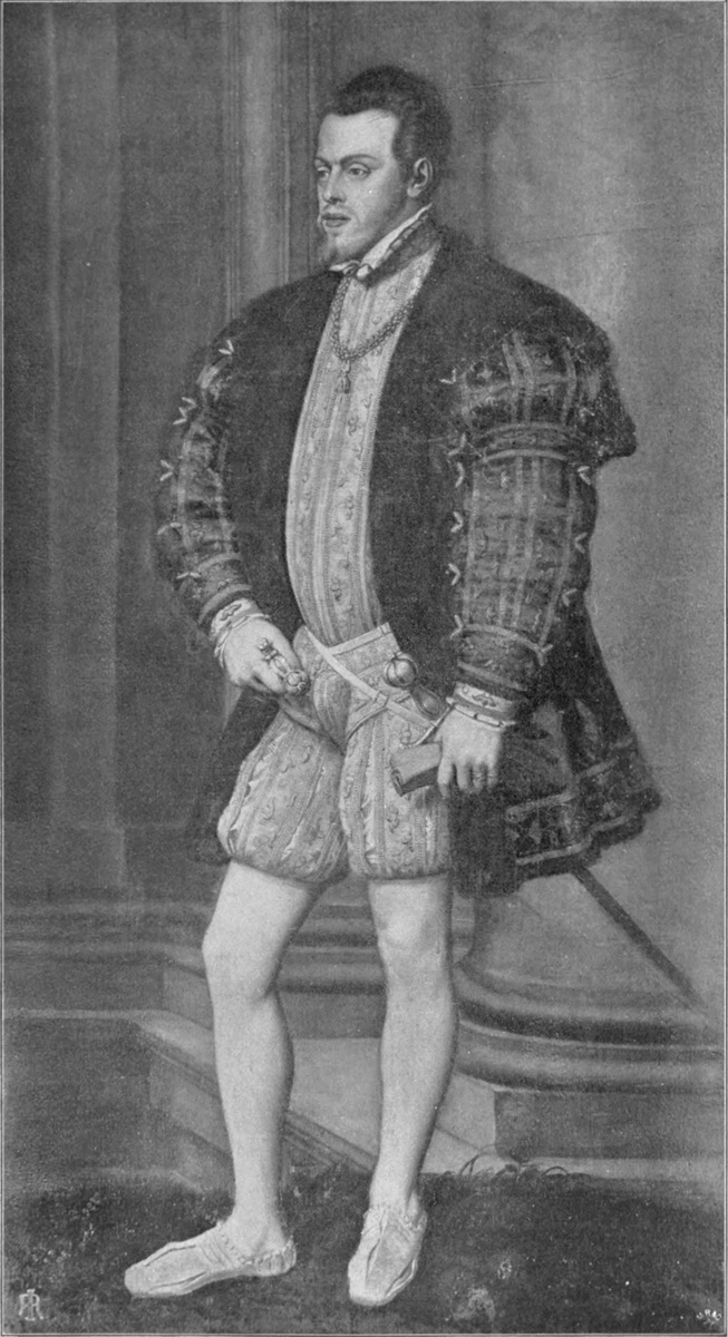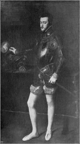 Der große Sieg über die Türken in der Seeschlacht bei Lepanto brachte Philipp II. auf den Gedanken eines Gemäldes, das, als Gegenstück zu dem Bilde Karls V. auf dem Felde von Mühlberg, ihn mit Bezugnahme auf die Schlacht von Lepanto darstellen sollte. Wie das Bild zu fassen wäre, gab der König dem spanischen Maler Sanchez Coello genau an, den er unter seinen Augen eine kleine Skizze zeichnen ließ. Dann ließ er durch denselben Künstler sein Porträt in Lebensgröße malen und sandte Bildnis und Skizze als Vorlagen für Tizian nach Venedig. Tizian, dem es begreiflicherweise keine besondere Freude machte, eine vorgezeichnete Komposition auszuführen, gab die gewandte Antwort, der Verfertiger der Vorlagen sei ein so tüchtiger Künstler, daß der König nicht nötig habe, fernerhin noch Bilder im Auslande zu bestellen. Aber Philipp II. blieb dabei, daß Tizian das Bild malen solle. Gegen Ende des Jahres 1574 war der Meister mit diesem Werk beschäftigt. Daß er es nicht mit Herzensfreude gemalt hat, sieht man dem jetzt im Pradomuseum befindlichen Gemälde wohl an. Es ist stumpf in den Formen und wirkt als Bild fast ebenso schwerfällig, wie sein allegorischer Inhalt. König Philipp II. steht in halber Rüstung an einer Art von Altar, an dessen Fuß ein gefangener Türke kniet; türkische Waffen und Abzeichen liegen am Boden. In der Ferne sieht man das Meer mit der brennenden türkischen Flotte. Der König hält ein nacktes Knäblein, den wenige Wochen nach der Schlacht von Lepanto geborenen Thronfolger Don Fernando, in die Höhe, der Siegesgöttin entgegen, die mit Lorbeerkranz und Palmenzweig in den Händen vom Himmel herabfliegt. Die Göttin gibt die Siegespalme dem Kind in das Händchen mit der Verheißung, die auf einem um den Zweig geschlungenen Bande zu lesen ist: „Majora tibi (möge dir noch größeres beschert sein)!“ — Trotz allem schwebt auch über diesem Bilde, wenn auch noch so abgeschwächt, ein Rest des alten Farbenzaubers; von dem alten Lichtzauber ist freilich nichts mehr hineingekommen.
