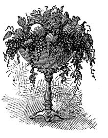 Although many ornaments may be used in decorating the table, yet nothing is so pretty and so indicative of a refined taste as flowers. If you have no épergne for them, use a compotier or raised dish, with a plate upon the top, to hold cut flowers; or place flower-pots with blossoming plants on the table. A net-work of wire, painted green, or of wood or crochet work, may be used to conceal the roughness of the flower-pot. A still prettier arrangement is to set the pot in a jardinière vase.