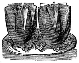 In “Gastronomie,” M. M. believes in a compromise on the carving question. He says, “There were professional carvers, and this important art was anciently performed at the sound of music, and with appropriate gesticulations. We wish our modern gourmands would follow the very good example of Trimal{19}chio in this respect, and, if they must have their viands carved on the sideboard by servants, take care that, like his carvers, they are trained to his art. We shall take the opportunity of entering our protest against an innovation which is going too far. That some of the more bulky pieces, the pièces de résistance, should be placed on the sideboard, well and good, though even to this Addison objected, and not without reason; but that the fish and the game should be both bestowed and distributed, like rations to paupers, by attendants, who, for the most part, can not distinguish between the head and the tail of a mullet, the flesh and fin of a turbot, etc., is enough to disturb the digestion of the most tolerant gastronome. We must say that we like to see our dinner, especially the fish, and to see every part of it, in good hands.”