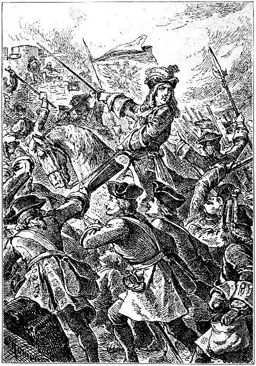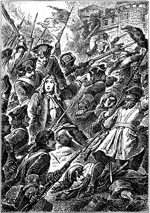But let us return to the siege of Lille. On the third of October the grand attack was made. Both sides fought with admirable courage. Eugene, as well as Bouffleurs, gave his men an example worthy of emulation; both fought in the front ranks. Eugene was wounded and fell to the ground. His men raised a shout of horror. “It is nothing!” he cried, covered the wound with his handkerchief and pressed forward. It was with great difficulty that his friends could persuade him to leave the battle-field while the assault was proceeding. A terrible slaughter began. The Frenchmen defended every inch of ground with heroic courage. The men fought with bayonets; they strangled one another with their hands; and all the time the heavy artillery of the besiegers was thundering and was opening new breaches here and there. Where the moats were not filled with wounded or dead bodies, they were piled up with bits of sod, gabions, and bundles of faggots to make them passable. At last Bouffleurs lost all hope of holding the city. Fighting, he retired into the citadel, which, after a defence of two months, he at last also surrendered to the allies.