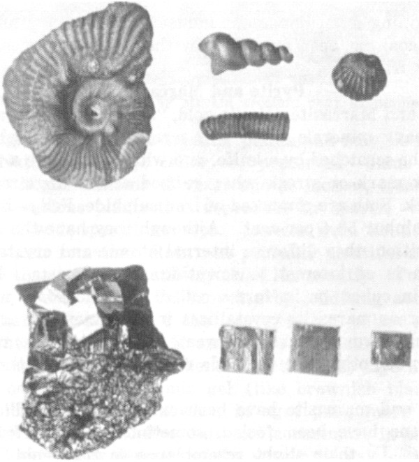 Fossils are also found and collected by persons who are interested in rocks and minerals. The varied remains of plants and animals long since petrified or replaced by mineral matter have stimulated the curiosity and become a source of enjoyment to many persons, from those who merely give a passing glance to the peculiar organic structures in the rocks to those who make a serious hobby or business of collecting and classifying the unreplaceable heritage from the ancient rocks. Fossils are interesting in part because of their variety, for they include petrified wood, shells like those of oysters, fish teeth, foot-prints, amber, dinosaur eggs, coal, imprints of fern leaves, of insects, and of fishes, and the bones of small and gigantic dinosaurs and elephants. In fact, a fossil is any evidence of life in the geologic past preserved in the rocks. Missouri rocks furnish fossils ranging in size from microscopically small fish teeth to the big skeletal remains of the mastodon, an ancestor of the elephant; but the most common ones are the structures and shells of ancient clams, corals, brachiopods, crinoids, and trilobites.