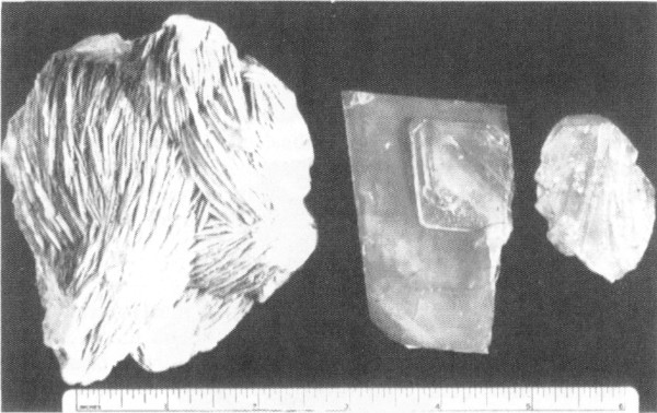 Three pieces of barite, the crested and bladed form at the left, “glass” barite in the center, and a small crystal at the right.