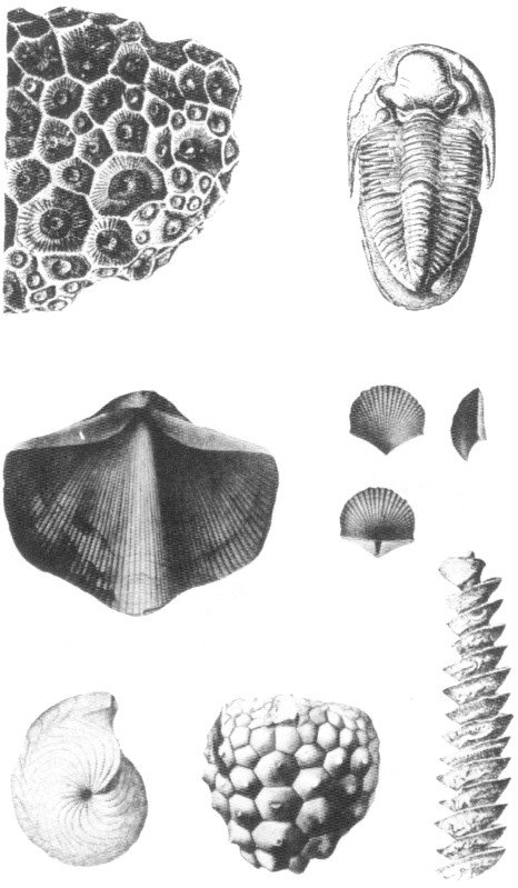 Fossils. Upper row, coral on left, trilobite on right; center row, brachiopods; lower row, coiled cephalapod, crinoid head, and a bryozoan spiral.