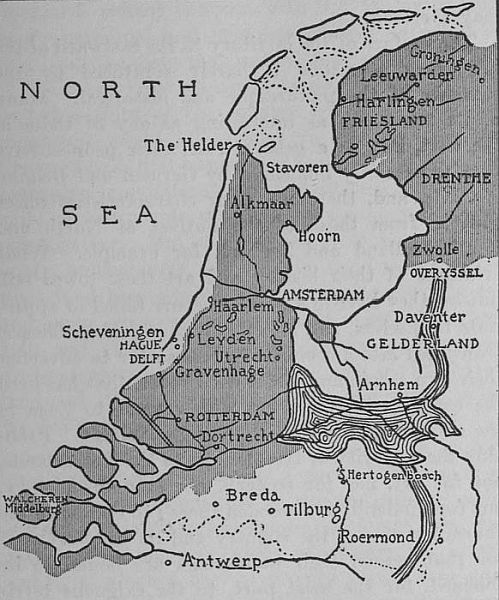 The shaded portions of this map of Holland and its immediate surroundings represent land that would be under water if by some inconceivable catastrophe all the dikes should break. The map gives, therefore, some idea of the never-ending struggle that the Hollander has faced and continues to face.