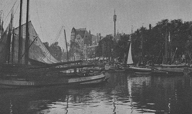 A few blocks to the east of the market square lies the Eusibiusbinnensingel, a beautiful park-like place, [195]but a mouthful to pronounce, with a lake in the center surrounded by great shade trees and geometrical flower plots. If you follow this to the northward, you will come, after a short walk, to the Velperplein, the pulse of Arnhem’s trolley traffic, the principal feature of which is a large building that goes under the poetical name of the Musis Sacrum, containing a restaurant and various halls for exhibitions. Here at the tables of the open air café the German tourists are wont to forgather for refreshment purposes, guarding the while their little ten-by-two-inch satchels, scarcely large enough to hold half a dozen cigars, as if they contained the entire wardrobe and family jewels of their owners.