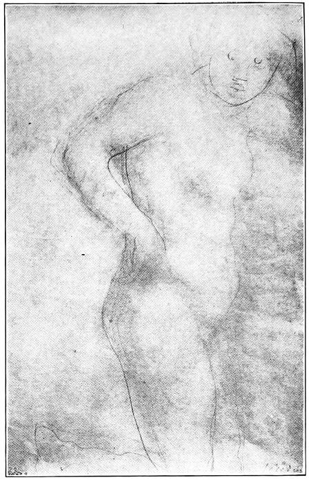 Approaching, you find that the main buildings are three. The first, a Louis XIII. pavilion of red brick and freestone with a high-gabled roof, serves as his dwelling. Close by stands a great rotunda, entered through a columned portico, which is the one that in 1900 sheltered the special exhibition of Rodin’s work at the angle of the Pont de l’Alma in Paris; as it pleased him, he had it reerected 6upon this new site and uses it as his atelier. A little further on at the edge of the hill, which here falls steeply away, you see an eighteenth-century château—or rather only a façade—whose fine portal, under a triangular pediment, frames a wrought-iron gate; of this, more later.