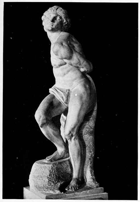 “I should like to think so,” Rodin answered with a sigh. We were now before the Captives, by Michael Angelo. We first looked at the one on the right, which is seen in profile. “Look! only two great planes. The legs to one side, the body to the opposite side. This gives great strength to the attitude. No balance of levels. The right hip is the higher, and the right shoulder is also higher. So the movement acquires amplitude. Observe the line of plumb—it falls not on one foot, but between the two; so both legs bear the body and seem to make an effort.