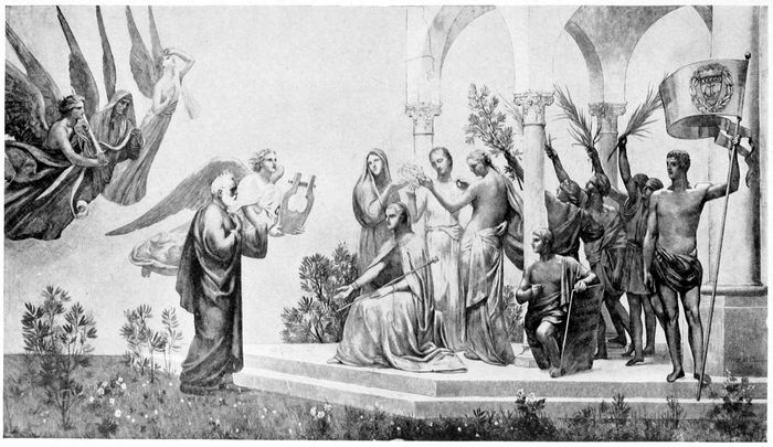 237“Take the greatest artist of our time, Puvis de Chavannes—did he not strive to shed upon us the serenity to which we all aspire? Are there not wonderful lessons for us in his sublime landscapes, where holy Nature seems to cradle upon her bosom a loving, wise, august, simple humanity? Help for the weak, love of work, self-denial, respect for high thought, this incomparable genius has expressed it all! It is a marvellous light upon our 238epoch. It is enough to look upon one of his masterpieces, his Sainte Geneviève in the Pantheon, his Holy Wood (Bois Sacré) in the Sorbonne, or his magnificent Homage to Victor Hugo (Hommage à Victor Hugo) on the stairway of the Hôtel de Ville in Paris, to feel oneself capable of noble deeds.