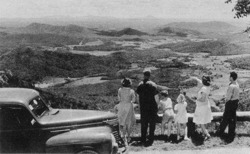 Blue Ridge Parkway, high road through Virginia and North Carolina, designed especially for the leisurely tourist, represents a new conception in roads. It is not an express parkway of the type built about the big cities, but a quiet way through a distinctive part of the American scene—a road intended for gypsy-like travel on the ride-awhile, stop-awhile basis.
