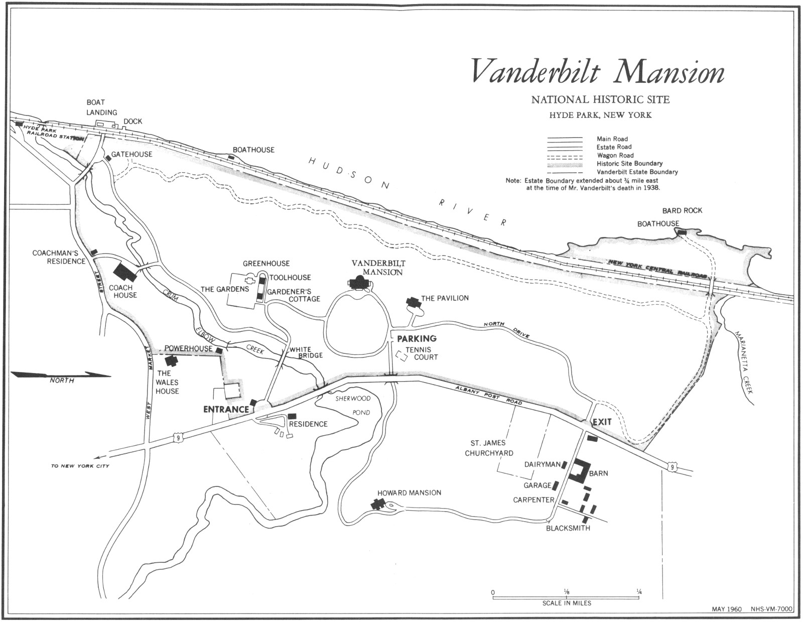 Vanderbilt Mansion National Historic Site is on the New York-Albany Post Road, U.S. 9, at the northern edge of Hyde Park, N.Y., about 6 miles north of Poughkeepsie, N.Y. From New York City, 82 miles away, you can reach it most conveniently by automobile over the Hendrick Hudson Parkway, the Saw Mill River Parkway, the Taconic State Parkway, U.S. 55, and U.S. 9. Approaches from the New York State Throughway and U.S. 9W on the west side of the Hudson River are by the Mid-Hudson Bridge at Poughkeepsie, the Rip Van Winkle Bridge at Catskill, or the Kingston-Rhinecliff Bridge at Kingston.