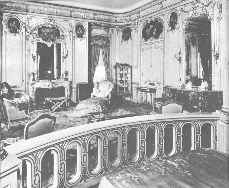 In this room, as in the Gold Room downstairs, there was an attempt at accurate reproduction. This room, designed by Ogden Codman, is a reproduction of a French queen’s bedroom of the Louis XV period. The bed is surrounded by a rail. (In French practice, courtiers gathered around the rail for morning levees.) The wall at the head of the bed is covered with hand-embroidered silk. Other walls are wood paneled and inset with French paintings. The heavily napped rug was made especially for this room; it weighs 2,300 pounds. Furniture is French 18th-century. Created by Paul Sormani, it is modeled on Louis XV period pieces. A curio case in front of the bedrail contains French fans and inside the rail is a prayer table and kneeling cushion.