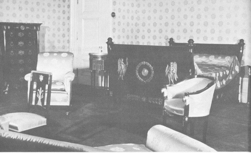 Adjoining the bedroom is the boudoir, furnished in the same motif. Notable pieces include a Dresden chandelier-and-candelabra set.