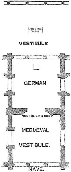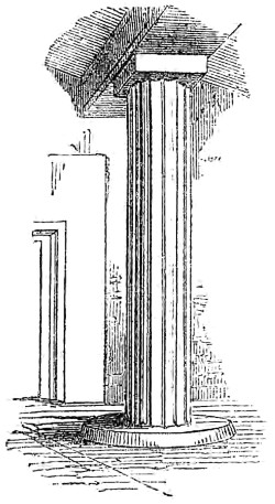 The roof of the ambulatory is panelled and decorated according to the prevailing style of the lighter coloured ceilings at Pompeii. The devices are formed of very thin lines of the brightest colours upon white. The Ionic capitals of the columns are from the Basilica. The shafts of the columns are not fluted at the lower part, the remaining unfluted surface, together with the mouldings upon the base, are painted bright red. This is a Pompeian peculiarity. Red is a prevailing colour at Pompeii, but in the House of the Surgical Instruments, the lower part of the columns was blue, a dwarf wall between them being painted red. (Gell, Pompeiana, first series, pl. 25, p. 170.)