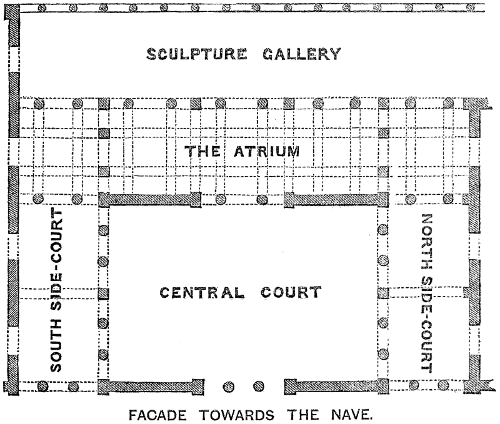 In the Atrium are placed two handsome marble benches, such as the clients might have sat upon whilst waiting for audience with their patron. The ends, which are elaborately carved, have been copied from an original model in the Vatican Museum, and the whole has been presented to the Crystal Palace Company by the London Marble Working Company, through their secretary, Mr. Clare.