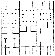 The triclinium was the dining-room of an ancient Roman house. The guests did not sit at table, they reclined on couches arranged round three sides of a space for the table, leaving the rest open for the servants to arrange the dishes and move the trays. The word triclinium is derived from the three couches occupying the apartment which surrounded the mensa or table in the manner just described. Much importance was attached, in ancient times, to the disposal of the guests. The right hand couch was the most honourable; the person reclining upon it, with his left elbow nearest the railing, was the chief person in the assembly. The Romans were accustomed to rest with the left arm upon cushions during their meals, and after dinner to lie upon their[V-63] backs and take their repose. In some Pompeian houses, the three couches forming the triclinium, were permanently fixed. The accompanying woodcut shows the arrangement of the places for a party of nine, the favourite number for a dinner among the Romans.