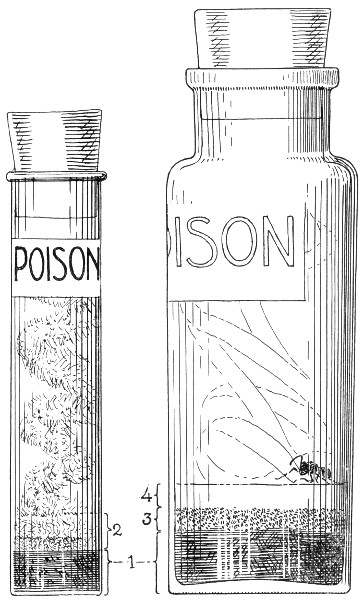 Fig. 3.—Cyanide killing bottles. The lethal chemical, 1, is potassium cyanide or calcium cyanide and is covered with a layer of cellucotton, 2, or sawdust, 3, and plaster of Paris, 4. The rest of the bottle is filled with soft, loosely crumpled, lint-free paper, which should be changed whenever it gets damp. The bottles should be tightly corked and labeled POISON. The collector should not test their strength by smelling.