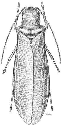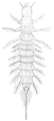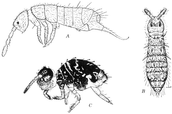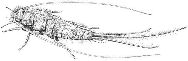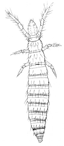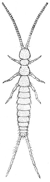 Small, whitish insects, about a twelfth of an inch long, that run rapidly. They live in small colonies in rotting sawdust, in rotten logs, and under the bark of stumps. They have fairly long antennae, chewing mouthparts, and a pair of short, inconspicuous tails. Most members of a colony are wingless, but occasionally there occurs a darker specimen having two pairs of wings. These wings have only a few veins. In Illinois only a single rare species has been found; it is called Zorotypus hubbardi Caudell, fig. 39.