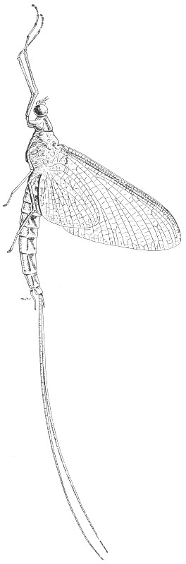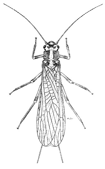 Insects that pass the young or nymphal stage in streams. They have slender, soft bodies and long tails; they move about rapidly. The adults are terrestrial in habit and occur along streams. In most species, the adults have two pairs of wings that are folded flat over the back; the number of crossveins varies from many to few. The antennae are long; the mouthparts are of the chewing type but greatly reduced. Of exceptional interest are stonefly adults that emerge in winter and are active from November through March. The winter forms can often be collected on bridges. Figs. 37 and 38 illustrate a spring species, Isoperla confusa Frison.