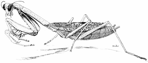 Insects with two pairs of wings, both pairs about the same size and shape and intricately netted with veins; antennae long and slender, mouthparts fitted for chewing, posterior end of body without tails. The green lacewings, including Chrysopa nigricornis Burmeister, fig. 52, are our commonest members of this order. The young or larvae of this order are entirely unlike the adults and are somewhat grublike in form. The aphid lion, the interesting larva of Chrysopa, fig. 53, is frequently collected by the sweeping method. Another interesting larva of this order is the doodlebug or ant lion, of Huckleberry Finn fame. The adult insects that mature from these ant lion larvae are very similar in appearance to the chrysopids or lacewings. The larva of each of these insects sinks its long, sharp, curved mandibles into the body of its prey and sucks out the body juices. The female Chrysopa has the curious habit of forming a long, slender 53 stalk under each egg; the bottom of the stalk is fastened to the upper side of a leaf. The stalks are thought to have the effect of keeping the first larvae of a hatch from devouring the eggs placed nearby.