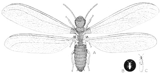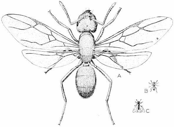 Fig. 58.—Hymenoptera. Lasius interjectus, a harmless winged ant, the yellow ant, with which the winged termite is often confused: A, queen with wings spread, many times natural size; B, worker ant, natural size; C, queen, approximately natural size, with wings partially closed and as usually seen. Ant has a narrower waist and shorter wings than termite. Actual length of queen about 0.3 inch.