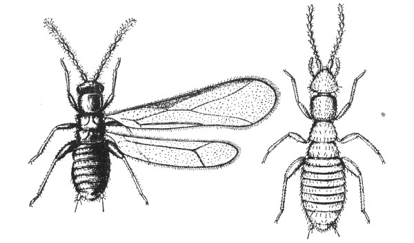 Fig. 39.—Zoraptera. Zorotypus hubbardi, the only zorapteron recorded from Illinois. The specimen on the left is a winged adult female; the specimen on the right is a wingless adult female. Actual length of adults about 0.08 inch.