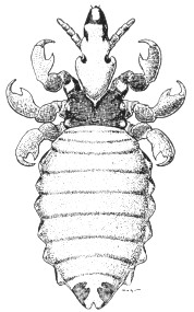 | Legs fitted for clinging to hairs, each leg ending in a large pincer, as in fig. 42; mouthparts retracted within head, consisting of a set of thin, needle-like parts fitted for sucking blood. Normally occurring only on mammals. The sucking lice | Suborder Anoplura |