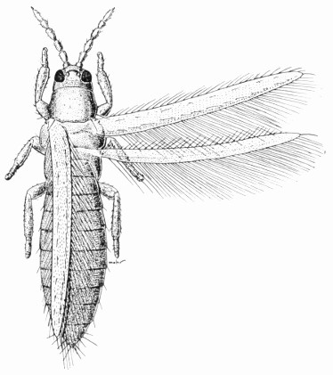 Small, active insects, usually about 0.1 inch long, rarely a quarter-inch long, very slender, usually each with two pairs of narrow wings and with the under side of the head forming a sharp, conelike sucking structure. Each wing has a long fringe on the hind margin; each front wing may have one or two veins running the length of the wing. The young of these insects are somewhat similar to the adults but are softer 48 bodied. Fig. 43 shows an adult of Thrips tabaci Lindeman, the onion thrips. Thrips suck the juice from plants. Because of their minute size, they are seldom noticed, but they can be collected in large numbers from blossoms of almost any plant. A few species of thrips, such as the onion thrips and the privet thrips, attack agricultural or horticultural plants and inflict considerable damage. A few species occasionally bite human beings.