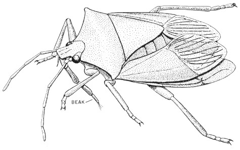 In the suborder Heteroptera, containing the stink bugs, the chinch bugs, and their allies, the beak is attached to the under side of the front part of the head; the base of the front pair of wings is hardened, and only the apical portion is membranous or delicate; the entire hind pair is delicate. In repose, the wings are folded over and flat against the body, the hind pair underneath. These characters are shown in fig. 44, which pictures a stink bug belonging to the family Pentatomidae. The young have the same general appearance and habits as the adults, but they lack wings. This suborder includes many common kinds, such as the water bugs, the water striders (these seldom develop wings even in the adult stage), the ambush bugs, and the lace bugs, as well as the stink bugs and the chinch bugs. The chief 49 pest of this group is the chinch bug, Blissus leucopterus (Say), fig. 45. Other pests include many kinds of plant bugs, of which Lygus lineolaris (Beauvois) is shown in fig. 46. The bed bugs, another group never developing functional wings, also belong in this suborder.