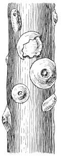 Fig. 48.—Hemiptera. Aspidiotus perniciosus, the destructive San Jose scale. The scale is cut away on upper specimen to show insect proper beneath. Diameter less than 0.1 inch.