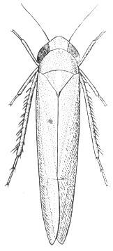 Fig. 49.—Hemiptera. Empoasca fabae, the potato leafhopper. This species is pale green. Some species are distinguished by bright red or yellow markings. Actual length about 0.1 inch.