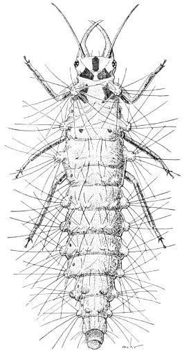 Fig. 62.—Trichoptera. Rhyacophila fenestra; the larva, shown here, is aquatic and builds no case. The larvae of some other kinds of caddisflies live in cases made of sticks and stones.