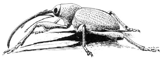 A great many of the serious insect pests, including kinds that attack field crops, stored products, and household goods, are beetles. Beetles of one group having the front of the head produced into a snoutlike structure, as in the genus Curculio, fig. 55, are called weevils or snout beetles. This group has maggot-like larvae and contains many of our worst pests, such as the plum curculio, cotton boll weevil, alfalfa weevil, and clover weevil. Bizarre and striking forms occur in many beetle groups, notably among the scarab and long-horn beetles. The largest in Illinois is the rhinoceros beetle, Dynastes tityus (Linnaeus); the males (one shown on the cover of this circular) have long projections on both head and thorax; the larvae live in rotten wood.