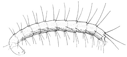 All the fleas, which feed on the blood of birds and other animals, have sucking mouthparts. They are powerful jumpers. The young stages are slender, white larvae, fig. 67, which live in the nests of various animals; these larvae are seldom collected. The fleas are found on the animals themselves or around their nests. Several species of fleas, including the cat and dog flea, the human flea, and the rat fleas, attack man. One of the rat fleas, Xenopsylla cheopis (Rothschild) is the common transmitter of the organism causing bubonic plague.