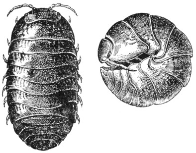 Convex, many-legged animals having conspicuous antennae; several of the posterior segments short and joined rather closely to form an abdomen. Of the Illinois forms, about one-half are aquatic, living in streams and ponds. The others live in terrestrial situations that are humid and dark. They are frequently found under boards and in soil in greenhouses. One species of this group is Armadillidium vulgare (Latreille), fig. 68, which possesses the ability to curl up in a hard shell-like ball when disturbed. The isopods, relatives of crabs, shrimps, and crayfish, belong to the general group known as crustaceans. The crustacean groups are abundant in the ocean. In past geologic ages, the early ancestors of such predominantly terrestrial groups as insects and spiders resembled ancestors of the present crustacean marine forms.