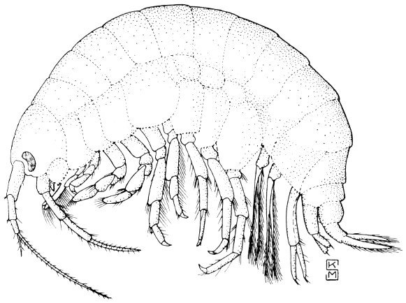 Humpbacked, many-legged crustaceans, fig. 69, that are, unlike the isopods, flattened from side to side like the fleas. They are all aquatic but are seldom found swimming in open water; they prefer to live in tangled masses of vegetation, under stones or logs, and among debris in the very shallow water where it touches the bank. 63 These little shrimps are never more than about one-half inch long and are frequently collected in large numbers along with aquatic beetles. As is the case with the aquatic sowbugs, certain species of amphipod shrimps occur in subterranean water sources and frequently are found in wells. Most of these species are blind.