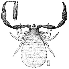 Animals belonging to the spider group; characterized by a pair of stout pincers at the end of the front legs, as in Larca granulata (Banks), fig. 71. They have short, stout bodies, each with five pairs of legs including the chelate front pair, but unlike the true scorpions they have no tails or stings. The pseudoscorpions are sometimes found indoors in old books, looking for their prey of small insects. They occur in greater numbers in wooded areas.